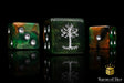 These contain a base of shimmering forest greens swirled with metallic copper veins and inlaid with a metallic silver; resin 16mm dice. The symbols are on the 6 side. These are square dice. Our premium dice now come in a unique reusable tin when purchased in x25 and x50 count.