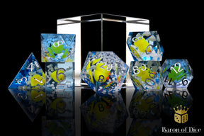 Duck... Duck.......Rubber Duck!! Will you be rolling the bath time favorite rubber duck dice set with us?! Featuring a resin casted rubber duck captured within each die. The dice are hand polished sharp corners, unique amongst our collection. This set is a clear Lucent with blue water base colored translucent with and inlaid with a crisp white; premium hand-mixed resin 16mm dice set containing D4, D6, D8, D10, D10, D12, and D20.