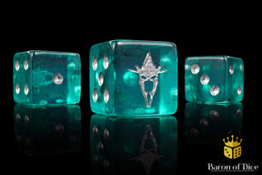 These contain a base of ghostly greenish-blues with swirling of black dye coursing through and inlaid with a metallic silver; resin 16mm dice.  The symbols are on the 6 side.  These are square dice. Our premium dice now come in a unique reusable tin when purchased in x25 and x50 count.