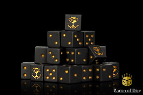 These contain a mixture of pure black swirled with jet blacks, with a matte finish. They are inlaid with a metallic bronze, fit for only third place; resin 16mm dice. The symbols are on the 6 side. These dice have an option of round or square corner, choose wisely! Our premium dice now come in a unique reusable tin.