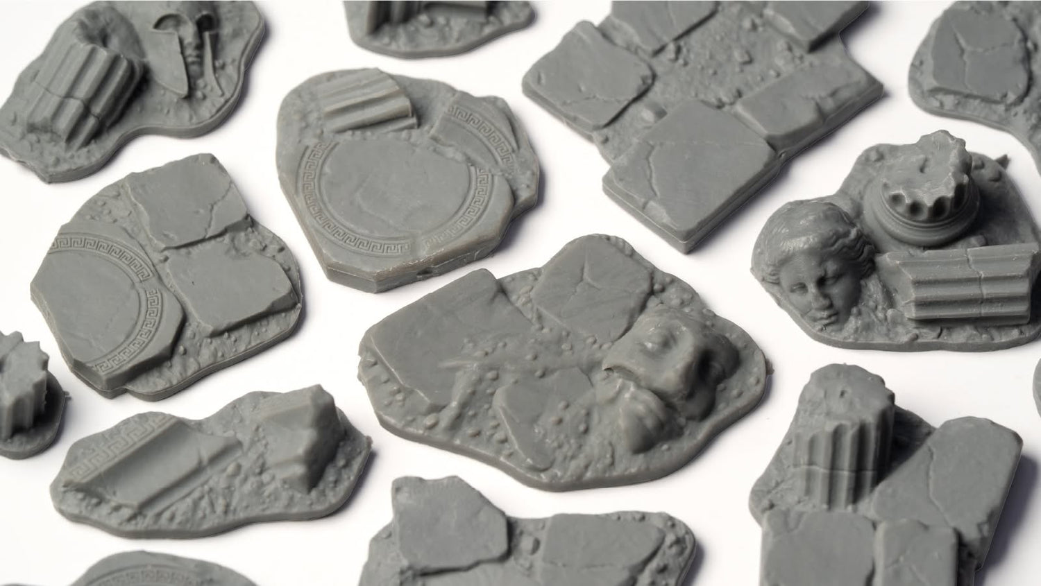 Temple Basing Bits are scaled fragments of architectural elements of a bygone ruined temple. Fragmented columns, broken pavements and sculptures, small pieces of ornamented friezes and sculptural panels, all with an antique classic flavour, are perfect for your ancient world reconstructions and sagas.